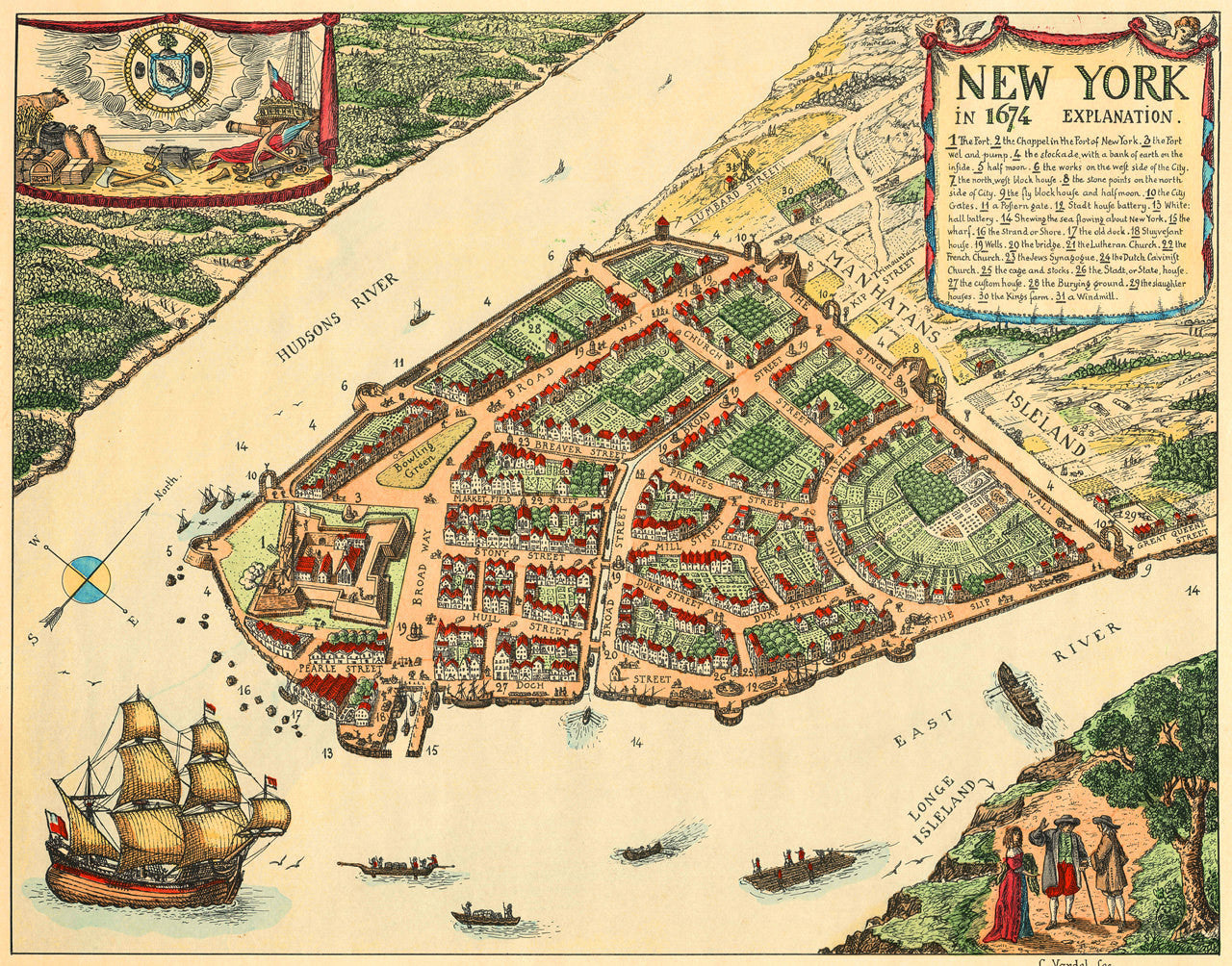 New York in 1674, Lower Manhattan, Vintage Map | Battlemaps.us